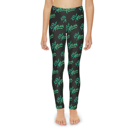 Batya Green Bat Mitzvah Pattern on Black Youth Full-Length Leggings