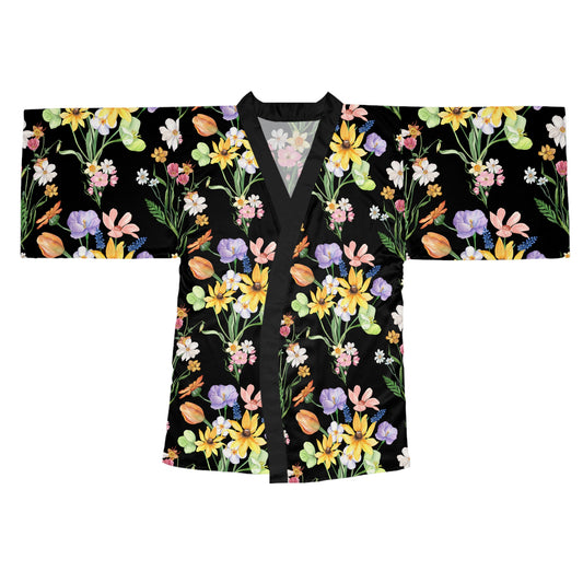 Yvonne Floral Pattern on Black Long Sleeve Kimono Robe