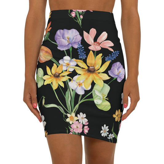 Yvonne Floral Pattern on Black Women's Mid-Waist Pencil Skirt